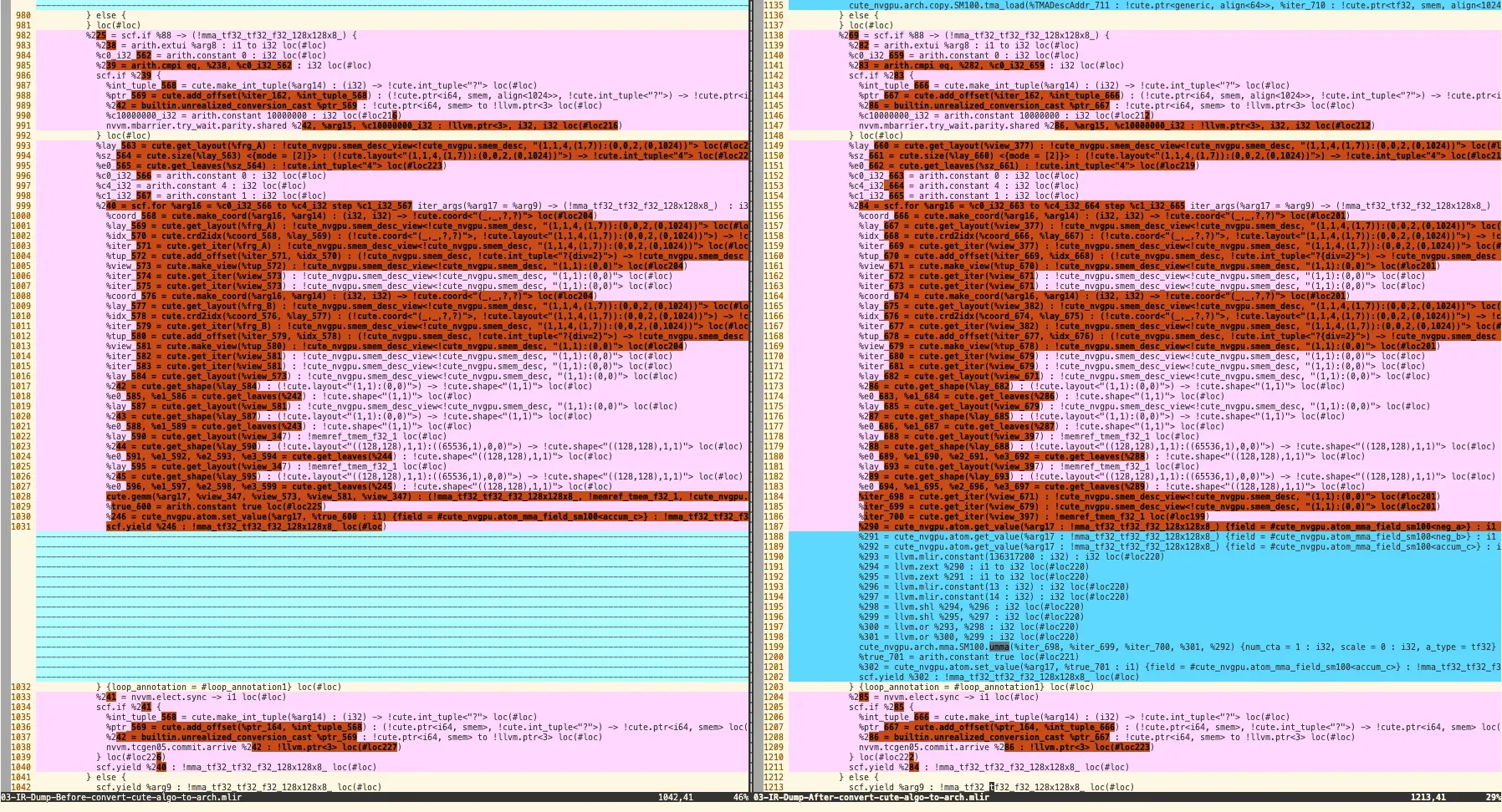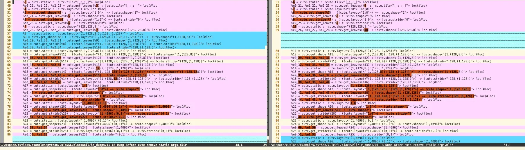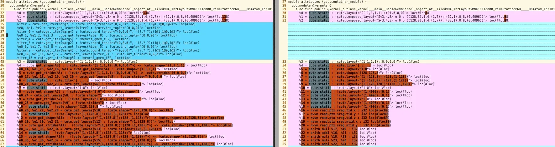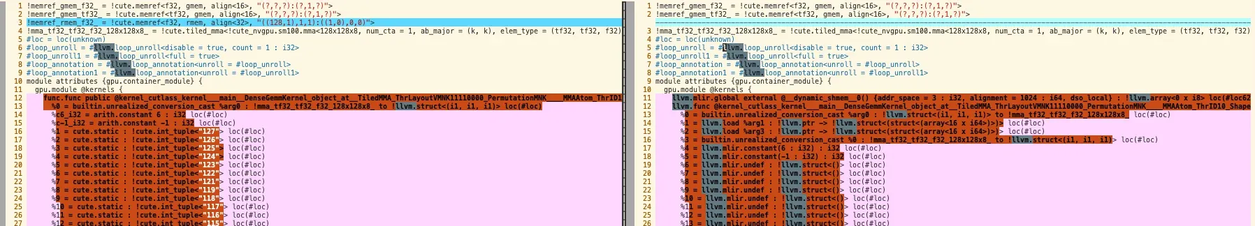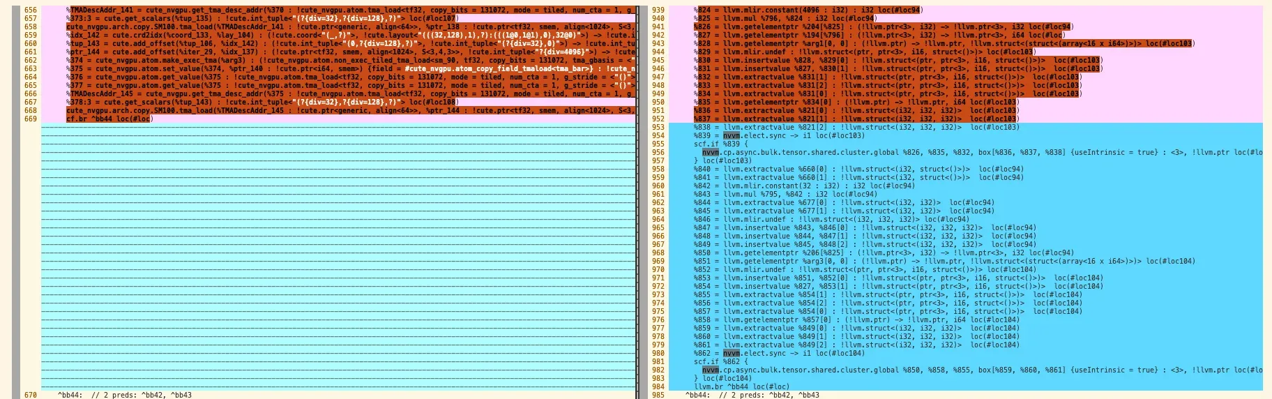 总结: CuTe C++ 高度依赖模板函数的特化,本质是将 PTX 内敛汇编 封装成模板函数,通过模板参数特化到不同的 TMA 指令;而 CuTe DSL 利用抽象出来的 cute dialect (包含 cutlass_gpu, cute_nvgpu等)逐步 lower 抽象,从 cute_nvgpu –> nvvm/scf/arith –> llvm,最后利用 llvm ir 生成 CUBIN(SASS),其中 JIT_executor 可以在 runtime 为 gpu_binary 设置动态 tensor shape。
