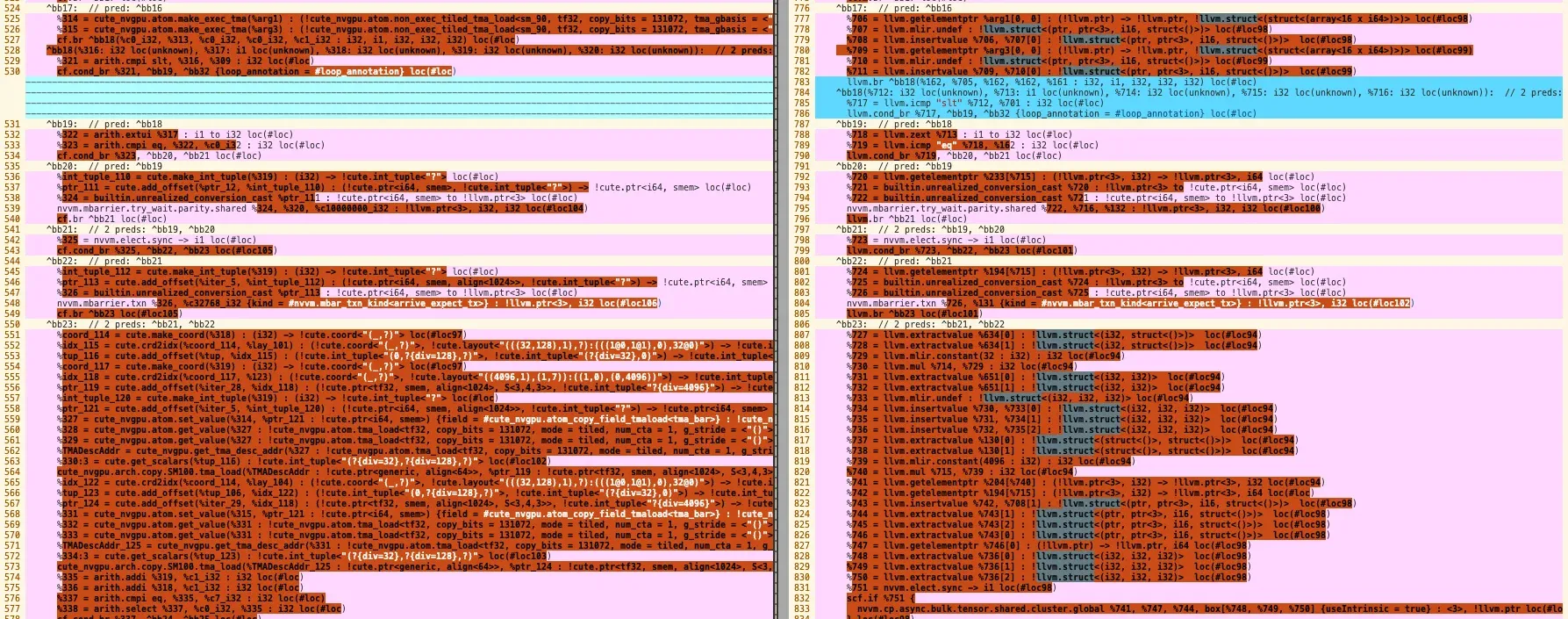 本文以 cp.async 指令(cutlass/blob/main/examples/python/CuTeDSL/blackwell/dense_gemm.py#L1804) 为例,对比 CuTeDSL Python 和 CuTe C++ 的路径。